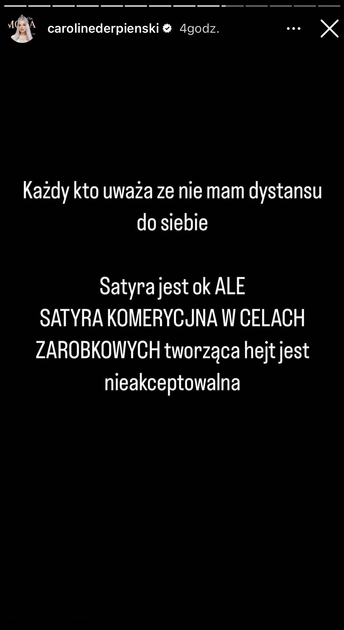 Każdy, kto uważa, że nie mam dystansu do siebie: satyra jest ok, ale satyra komercyjna w celach zarobkowych tworząca hejt jest nieakceptowalna – zaczęła.