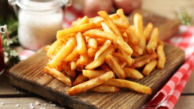 - Ziemniaki obieramy i kroimy na grube frytki. Wkładamy do miski z zimną wodą, przepłukujemy i odcedzamy. Ponownie zalewamy wodą, słodzimy cukrem pudrem i odstawiamy na kilka minut.