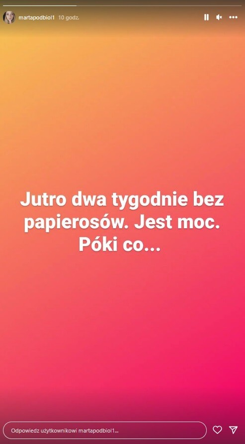 Okazuje się, że mieszkanka Katowic jest wytrwała w swoim postanowieniu. Mimo trudności nadal nie pali, o czym poinformowała na swoim Instagramie. Jak dotąd bez papierosa wytrzymała dwa tygodnie. Życzymy wytrwałości!
