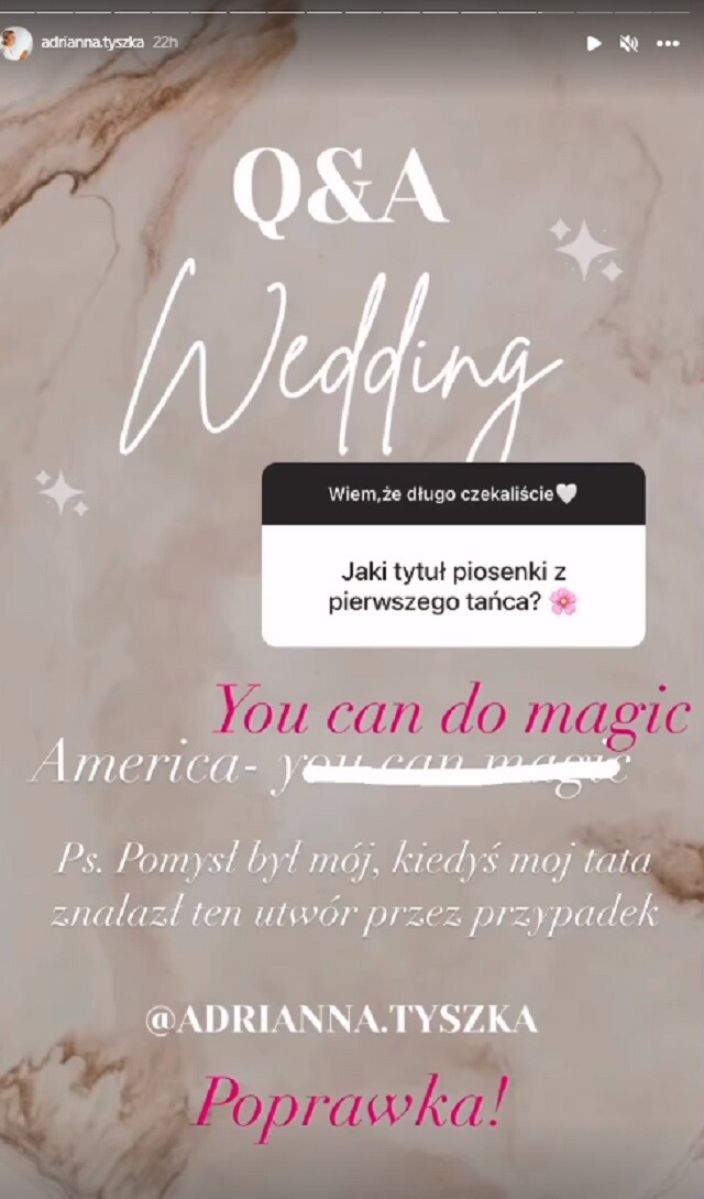 Adrianna z „RszŻ 9” zorganizowała na swoim instagramowym koncie sesję „Q&A”. Podczas wymiany zdań z internautami opowiedziała nieco więcej o samej organizacji uroczystości. Jedno z zapytań dotyczyło piosenki wybranej do pierwszego tańca. Był to utwór zespołu America: „You can do magic”. Przy okazji wyjawiła, jak „trafiła” na wspomnianą piosenkę.