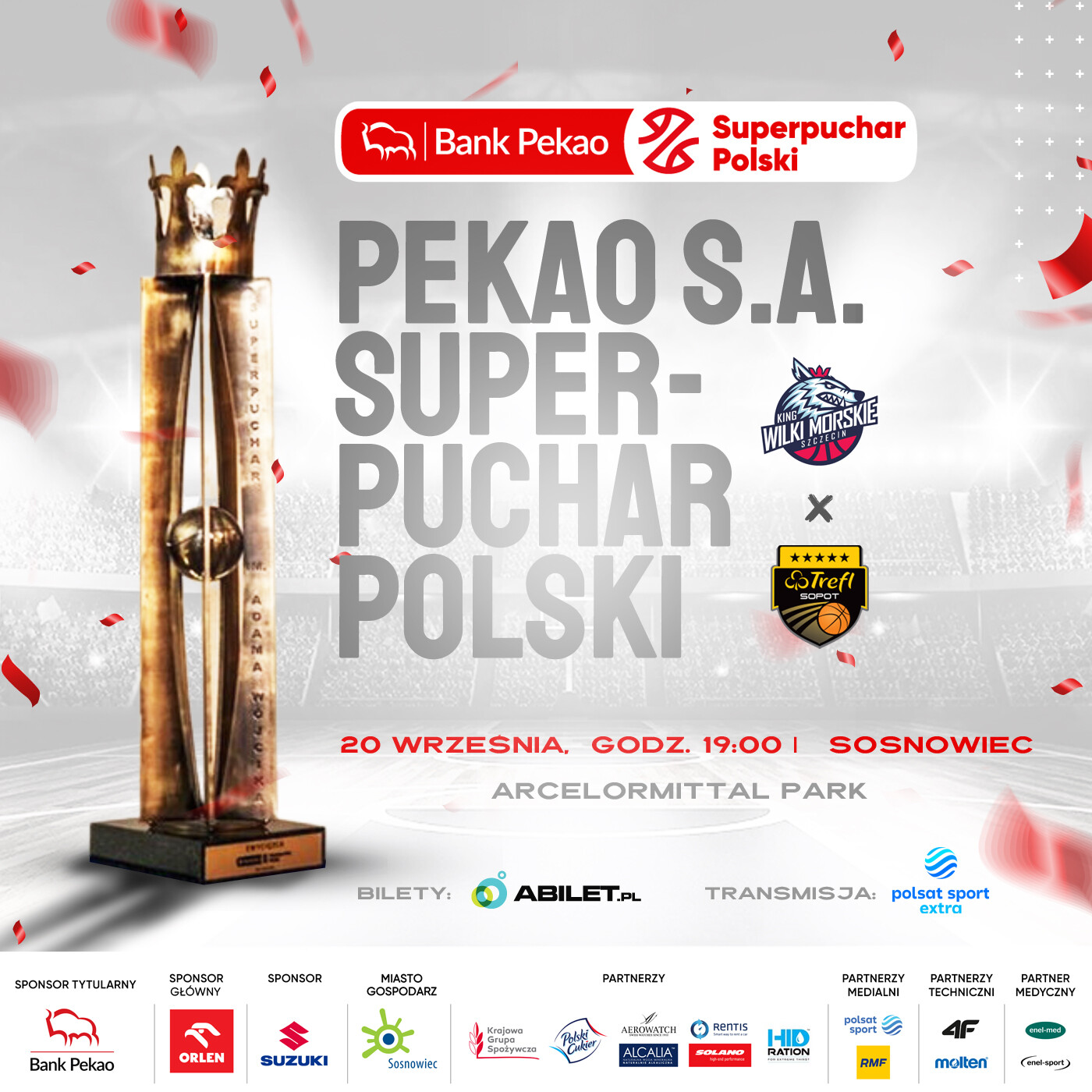 Czeka nas doskonała inauguracja koszykarskiego sezonu 2023/2024! W spotkaniu o Pekao S.A. Superpuchar Polski 20 września o godz. 19:00 zmierzą się czołowe zespoły: ORLEN Basket Ligi - mistrz Polski, King Szczecin oraz zdobywca Pucharu Polski, Trefl Sopot. Mecz odbędzie się w Arenie Sosnowiec wchodzącej w skład ArcelorMittal Park, a transmisję zobaczymy w Polsat Sport News.