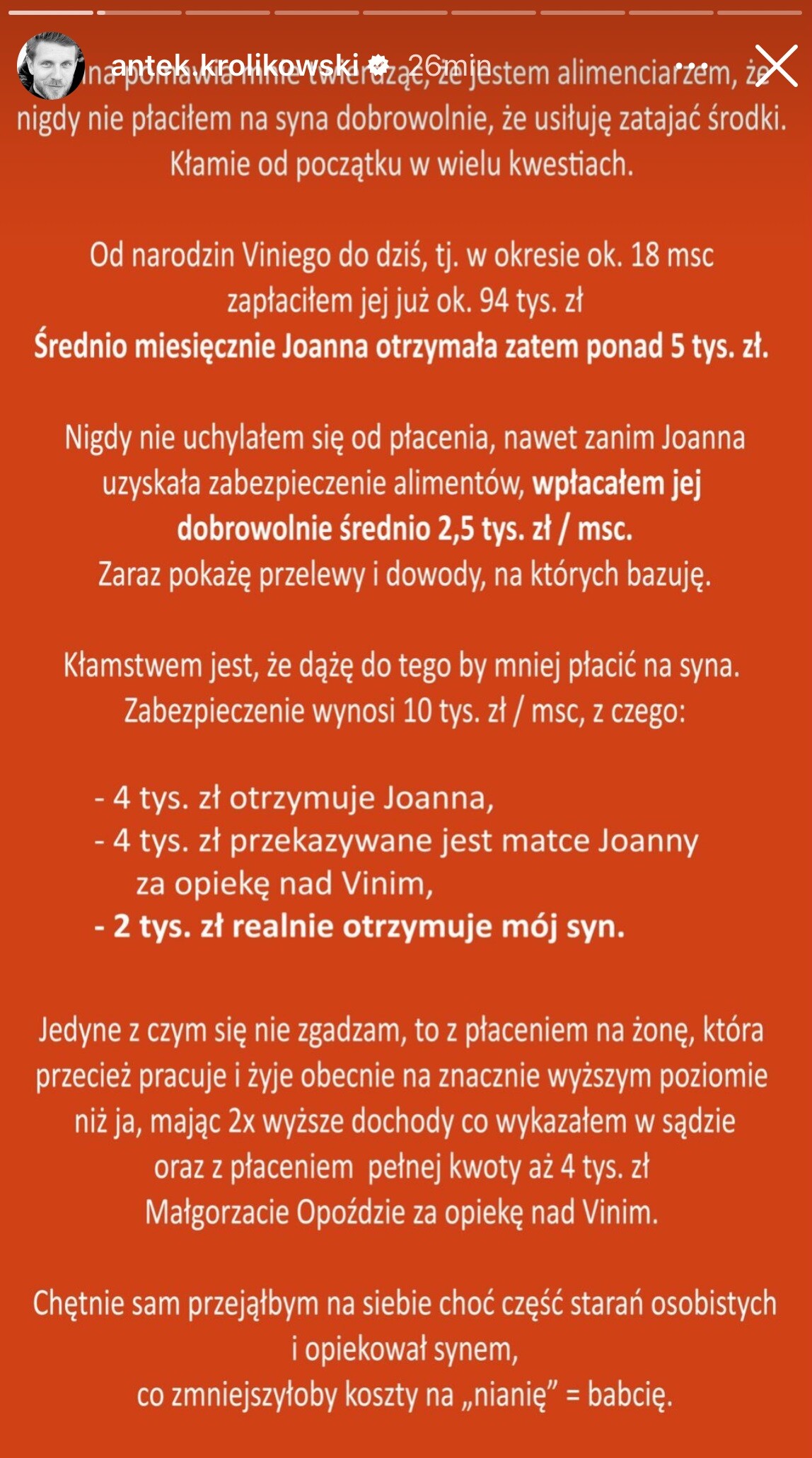 We wtorkowy wieczór Antek Królikowski postanowił odnieść się do zarzutów ze strony matki Viniego. Celebryta w obszernym oświadczeniu zarzucił byłej partnerce manipulowanie faktami i przedstawił na to własne dowody. Jak sam napisał, zrobił to, ponieważ jego zdaniem Opozda naruszyła tajemnicę z niejawnej sprawy rozwodowej.