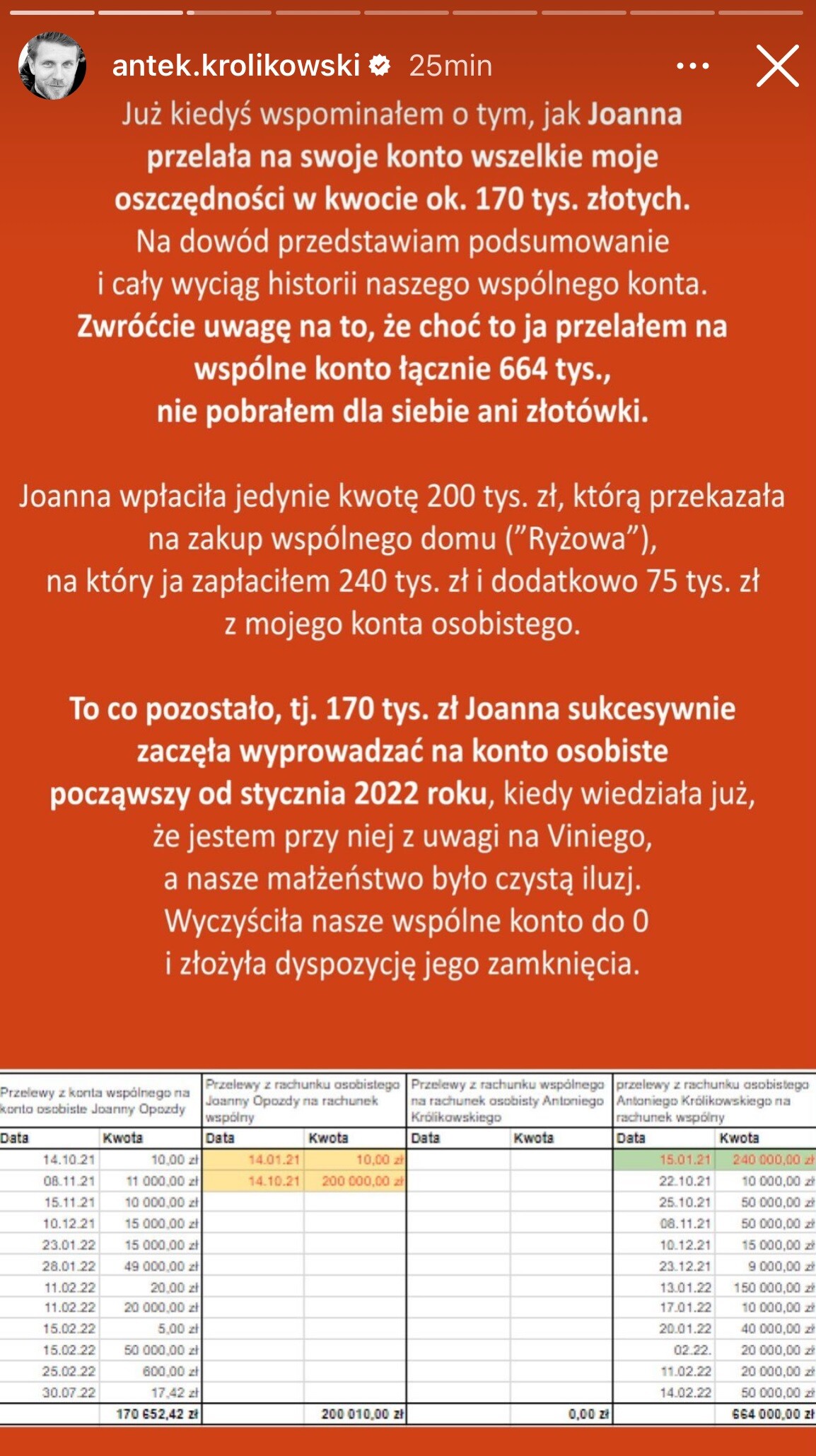 Macie prawo mnie oceniać, jednak jeśli chcecie to robić, zapoznajcie się proszę z dowodami, które dalej zamieszczam i wytrwajcie do końca, bo na koniec ujawniam, jak to Joanna manipuluje wami, mediami i wszystkimi włącznie ze mną, od lat – zaczął Królikowski.