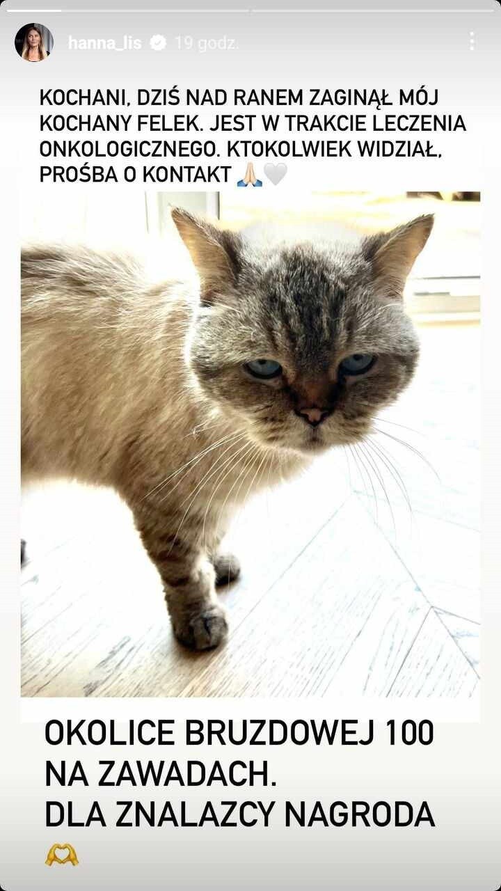 Lis odchodziła od zmysłów – tym bardziej, że schorowane zwierzę jest leczone onkologicznie. Zdruzgotana 53-latka zwróciła się do swoich blisko 150 tysięcy instagramowych obserwatorów z prośbą o jakiekolwiek informacje, gdyby widzieli Felka. Zaoferowała nagrodę.
