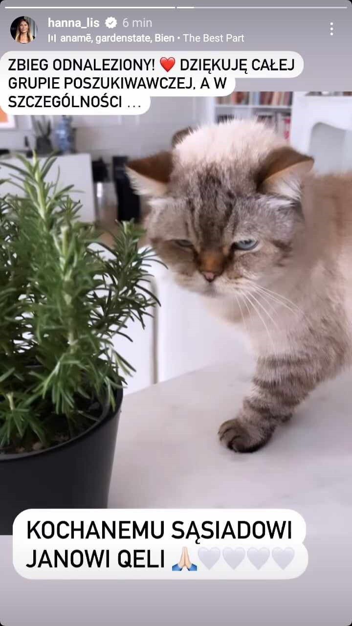 Hanna Lis przeżyła trudną noc, po której jednak nadeszły dobre wieści. W poszukiwania kota Felka włączyła się grupa osób, którym – jak wynika z zamieszczonej w sobotę tuż przed południem relacji 53-latki – udało się odnaleźć zaginionego. Lis opublikowała na Instagramie wpis z podziękowaniami dla tych, którzy okazali jej wsparcie.