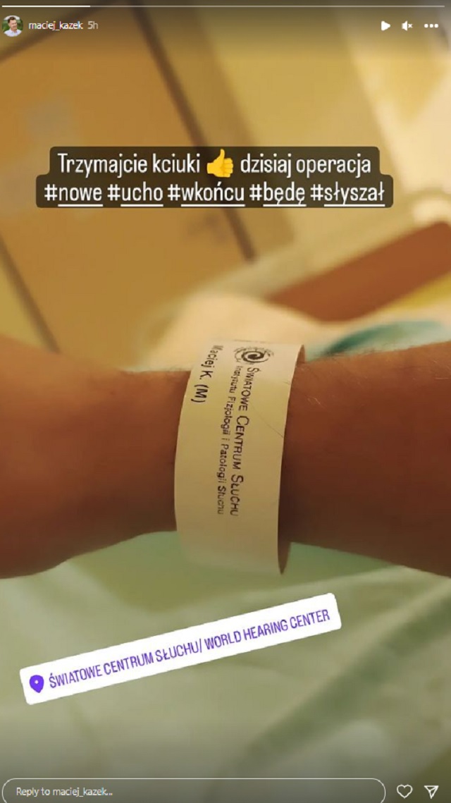 Trzymajcie kciuki. Dzisiaj operacja. #nowe #ucho #w końcu #będę #słyszał – napisał 17 października na fotografii wykonanej w szpitalu.
