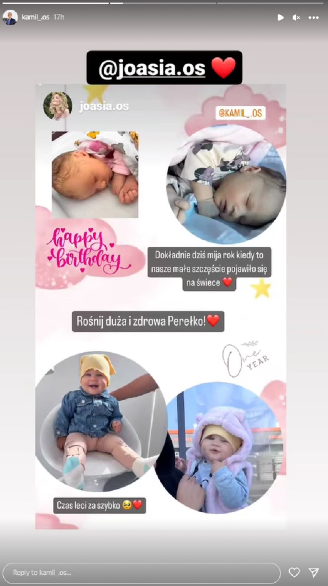 U państwa Osypowiczów radosnego świętowania ciąg dalszy! W minionych dniach rodzice Tosi wyprawili jej przyjęcie, na które zaprosili bliskich i przyjaciół. Wspomnienie narodzin znalazło się również na jednej z instagramowych relacji Joanny. Post z urodzinowymi życzeniami i fotografiami córeczki udostępnił u siebie także Kamil.