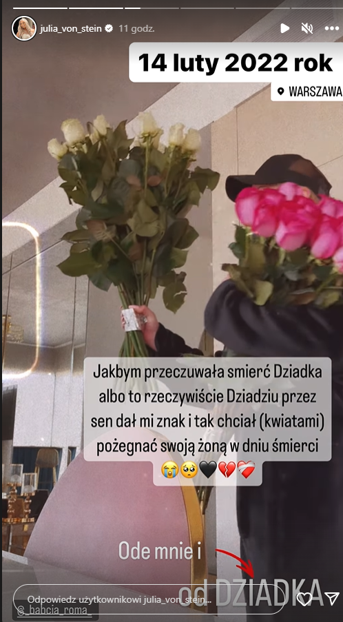 W ostatnim odcinku „Diabelnie boskich” von Stein podzieliła się wspomnieniem z dnia, gdy zmarł jej dziadek. Jak się okazuje, Julia miała wtedy sen, w którym „coś” nakazało jej kupić kwiaty dla babci. Gwiazda interpretuje sytuację jako znak od ukochanego dziadka.