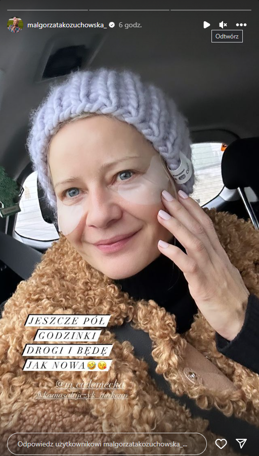 Na Instagramie Małgorzaty Kożuchowskiej pojawiła się ostatnio relacja, na której aktorka pokazała się w całkowicie naturalnej wersji. Na jej twarzy nie było ani grama podkładu, za to pod oczami znajdowały się specjalne płatki kosmetyczne – ich zadaniem jest między innymi nawilżenie delikatnej skóry oraz pozbycie się tzw. worków pod oczami, które często pojawiają się po nocy.