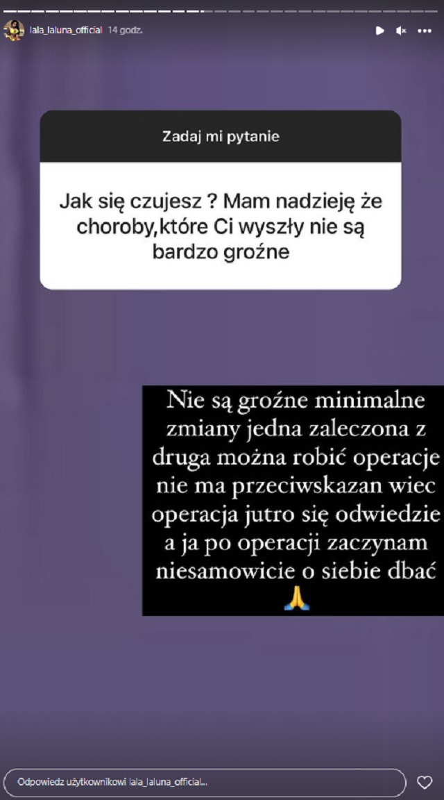 Laluna Unique opublikowała na Instagramie wpisy, w których wyjawiła, że udała się do placówki medycznej, gdzie wykonano jej szereg badań. Wspomniała także o operacji: