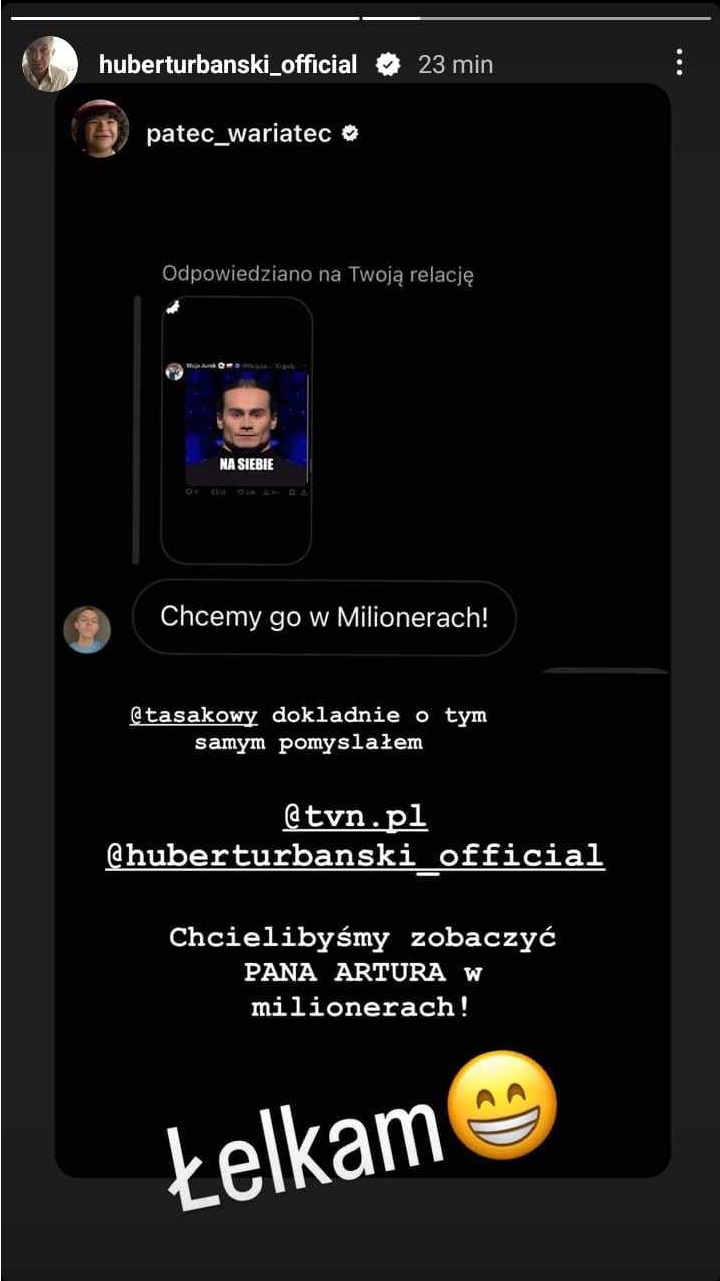 Pomysł ze zgłoszeniem się rekordzisty z „Jednego z dziesięciu” do „Milionerów” urósł do tego stopnia, że głos w sprawie zabrał sam Hubert Urbański. Do tablicy został wywołany przez youtubera Jakuba Pateckiego. Udostępniając na InstaStories jego relację, gospodarz teleturnieju emitowanego na antenie TVN dał jasno do zrozumienia, co o tym sądzi.