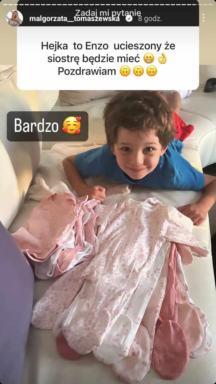 W innym kafelku szczerze przyznała, że było to bolesne doświadczenie, ale „szybko się o tym zapomina”. Wszystko zobrazowała fotografią, na której czule tuli nowo narodzonego Enzo. Pokazała również jego aktualne zdjęcie i zdradziła, że bardzo cieszy się na narodziny siostry.