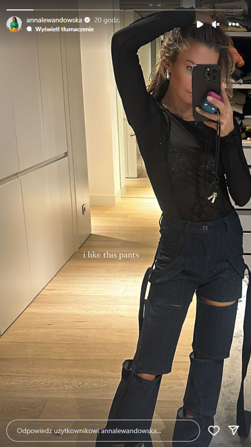 Na relacji InstaStory Lewandowskiej pojawiło się zdjęcie, na którym celebrytka zaprezentowała swoją ostatnią stylizację. Uwagę zwracały zwłaszcza spodnie, które posiadały w kilku miejscach rozcięcia – na udach, kolanach i łydkach. To jednak nie koniec – po bokach znajdowały się jeszcze luźne taśmy materiału, które zawieszone były pod kieszeniami. Na zdjęciu Anna umieściła dopisek sugerujący, że takie specyficzne jeansy mocno przypadły jej do gustu: