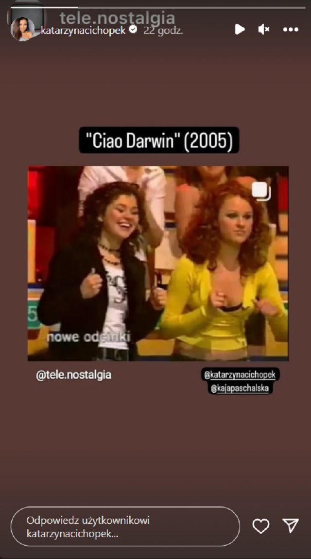 Z informacji dodanej do wspomnianego kadru wynika, iż obie panie w 2005 roku wzięły udział w nagraniach do show: „Ciao Darwin”. Fotografię opublikował profil: „Tele nostalgia”, a gwiazda „Emki” na swoim koncie pozostawiła „ścieżkę” do wspomnianej publikacji. Trzeba przyznać, że od momentu powstania ujęcia obie panie sporo się zmieniły. Obecnie Katarzyna Cichopek zamieniła kręcone włosy na proste pasma. Kaja Paschalska również chętnie eksperymentuje z fryzurą, prezentując się użytkownikom sieci w rozmaitych wydaniach. Oglądaliście wspomniany program?