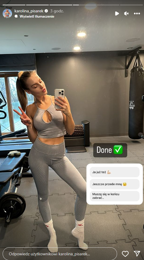 Influencerka wrzuciła też na InstaStory zdjęcie, które wykonała tuż po treningu. Kobieta pozuje na nim w szarych leginsach i topie z wycięciem na biuście.