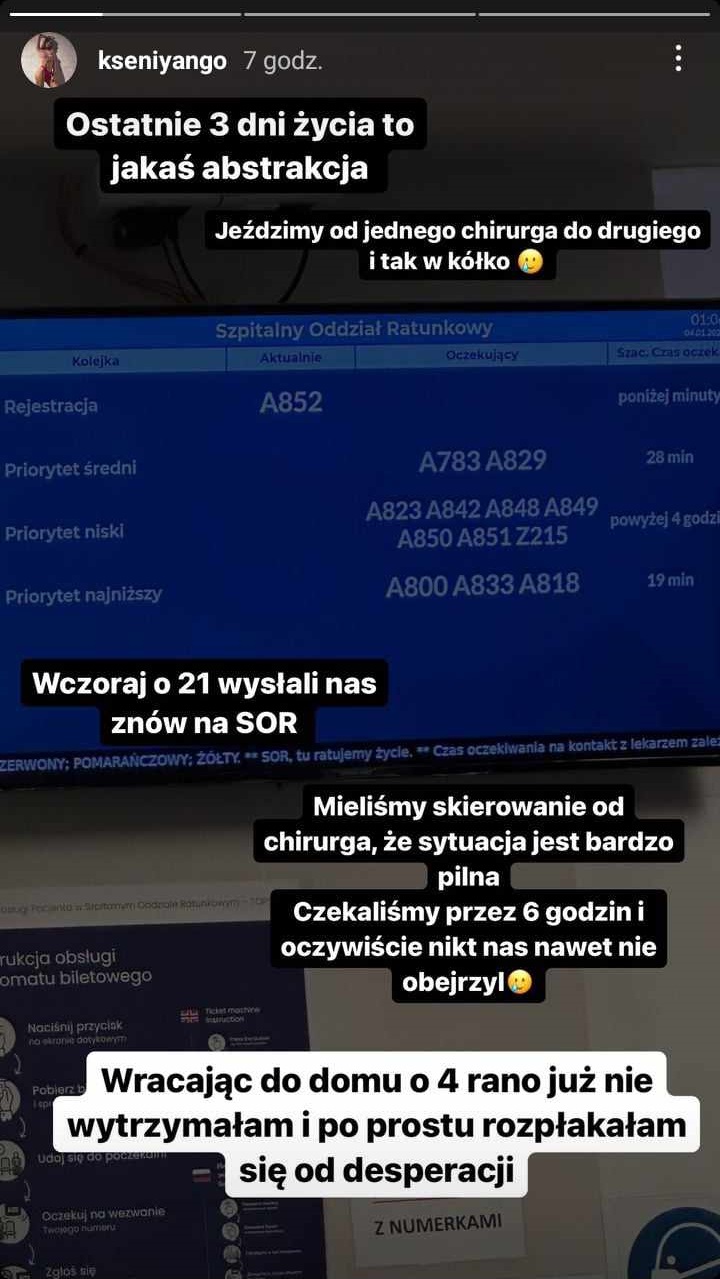 Ostatnie trzy dni życia to jakaś abstrakcja. Jeździmy od jednego chirurga do drugiego i tak w kółko. Wczoraj o 21. wysłali nas znów na SOR. Mieliśmy skierowanie od chirurga, że sytuacja jest bardzo pilna. Czekaliśmy przez sześć godzin i oczywiście nikt nas nawet nie obejrzał. Wracając do domu o czwartej rano już nie wytrzymałam i po prostu rozpłakałam się od desperacji – napisała na Instagramie.