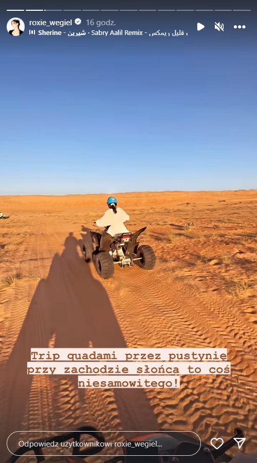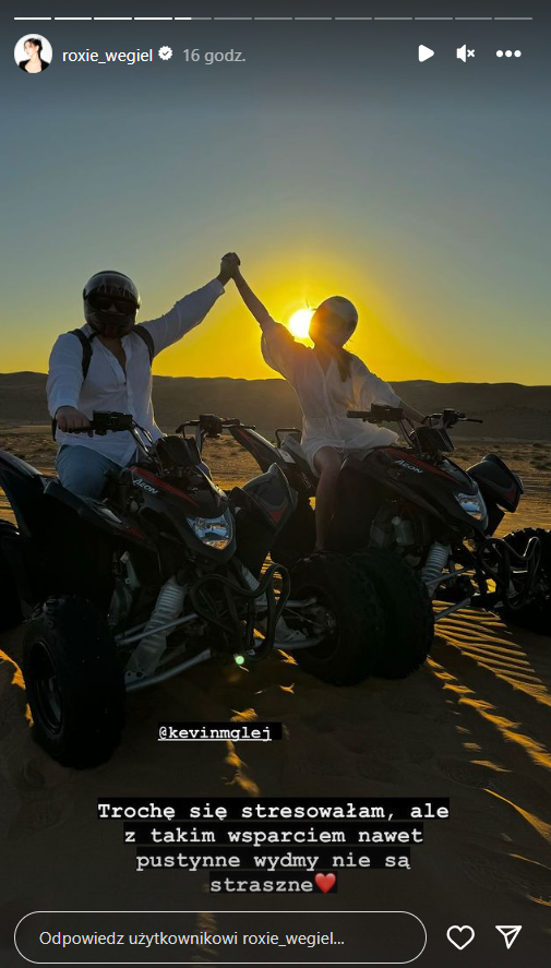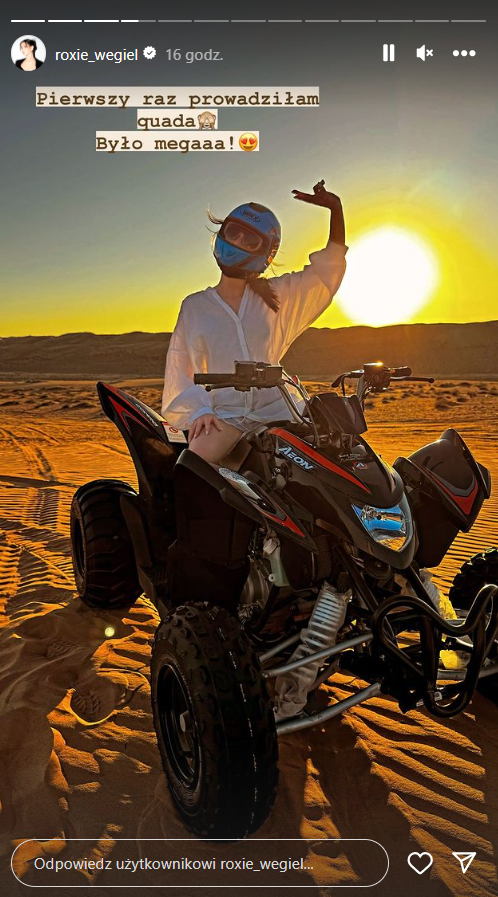 W mediach społecznościowych Roksany pojawiła się relacja z ostatnich dni. Wokalistka i jej ukochany wybrali się na pustynię – wzięli tam udział w dwóch wydarzeniach. Pierwszym z nich był rajd na quadach, który pomimo początkowego stresu, bardzo spodobał się Roxie.
