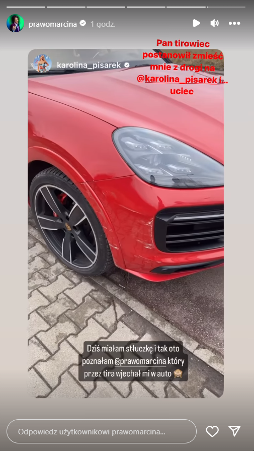 W piątek 26 stycznia na Instagramie Karoliny Pisarek pojawiła się relacja, w której kobieta poinformowała swoich fanów o bardzo nieprzyjemnym wydarzeniu, które miało miejsce przed chwilą. Modelka wracała do domu, jadąc drogą szybkiego ruchu. Nagle przed nią pojawiło się cudze auto i… wjechało w jej pojazd. Influencerka zaznaczyła, że nie odniosła żadnych obrażeń, czego jednak nie można powiedzieć o jej samochodzie.