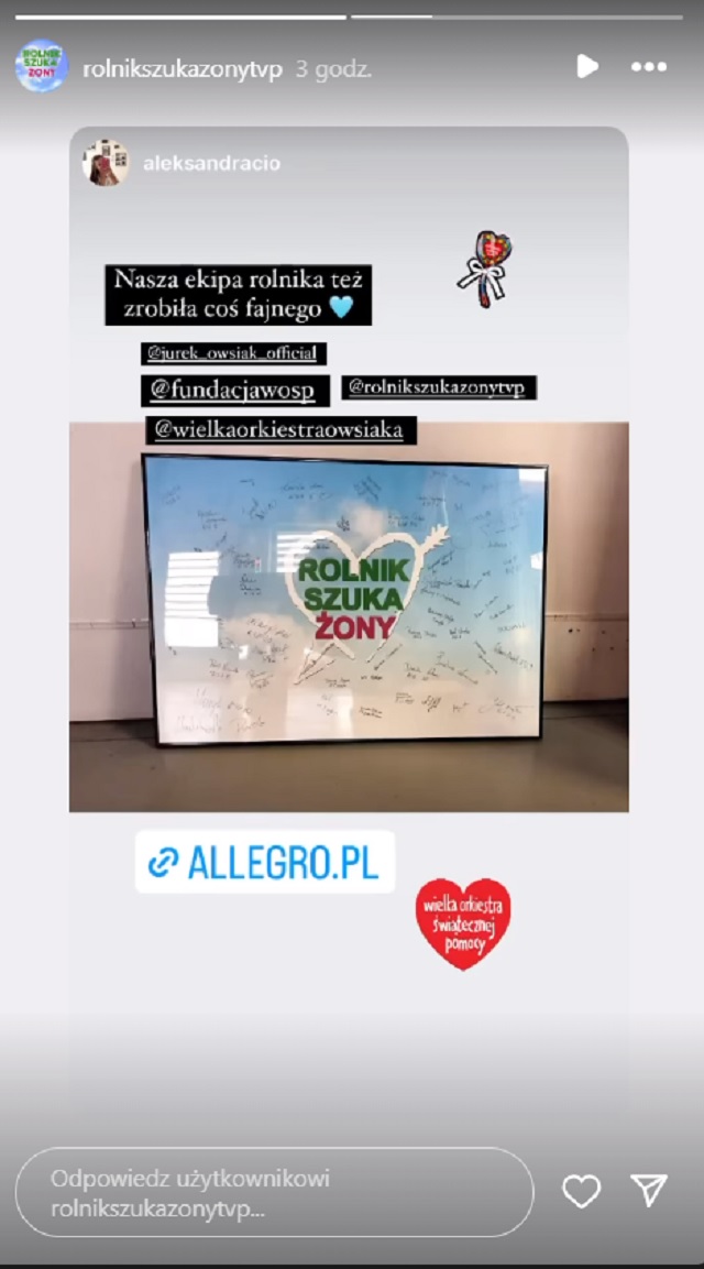 „Rolnik…” nie tylko pomógł wielu osobom poznać „drugą połówkę”, ale też sprawił, że nawiązały się piękne przyjaźnie. Uczestnicy show utrzymują ze sobą kontakt, a także wspólnie chcą czynić dobro. Świadczyć może o tym ich najnowsza akcja – bohaterowie projektu TVP postanowili włączyć się w zbieranie środków w ramach Wielkiej Orkiestry Świątecznej Pomocy. Z tej okazji wystawili na aukcję specjalny plakat z podpisami wielu osób z różnych edycji programu: „Rolnik szuka żony”. Informacja o takim przedsięwzięciu pojawiła się na oficjalnym instagramowym profilu show. O zbiórce wspominały też w sieci m.in. Aleksandra i Joanna z 8. sezonu.