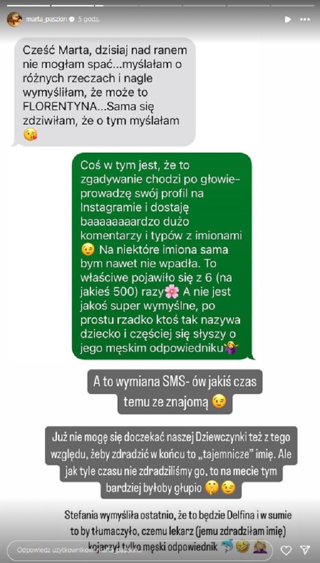 Następnie Marta odniosła się do wiadomości otrzymanej jakiś czas temu od znajomej. Wprost przyznała, iż nie chce wyjawiać imienia wybranego dla maluszka, chociaż utrzymanie tej wiadomości w tajemnicy jest już dla niej nieco uciążliwe: