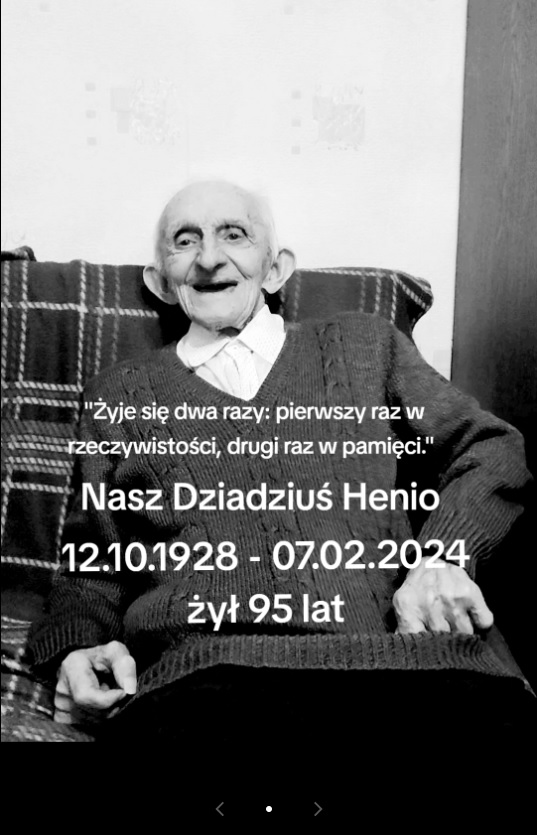 „Żyje się dwa razy: pierwszy raz w rzeczywistości, drugi raz w pamięci”. Nasz dziadziuś Henio 12.10.1928-07.02.2024 żył 95 lat – czytamy.