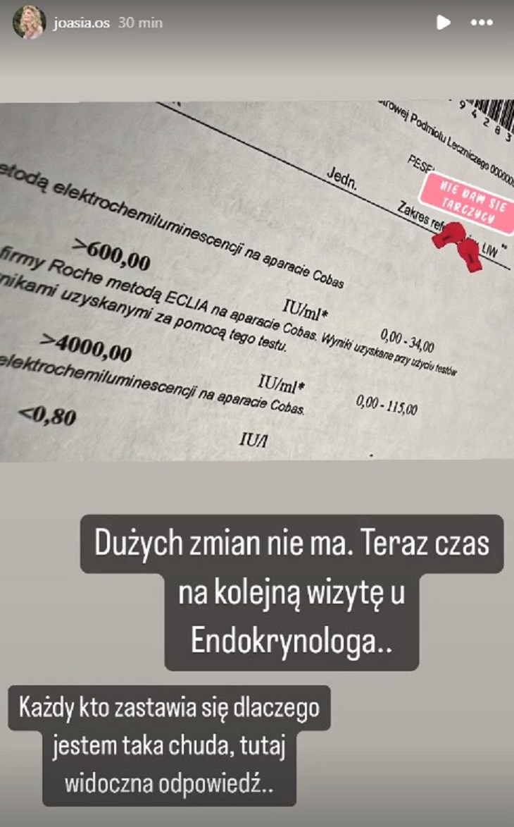 Ostatnio 24-latka wrzuciła na Stories zdjęcia aktualnych wyników badań robionych pod kątem nadczynności tarczycy. Uczestniczka "RszŻ" skomentowała fotografię: