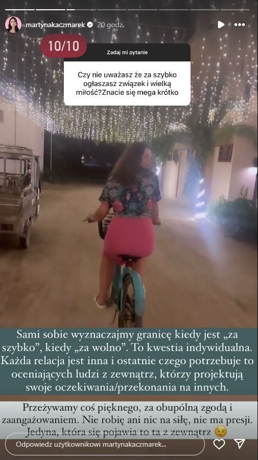 Ostatnio influencerka zorganizowała małą sesję pytań i odpowiedzi. Internauci zapytali między innymi o to, czy nie weszła w nowy związek za wcześnie. Osoba zadająca pytanie wzięła tutaj pod uwagę fakt, że Martyna ze swoim wybrankiem zna się dość krótko, a już ogłasza wielką miłość.