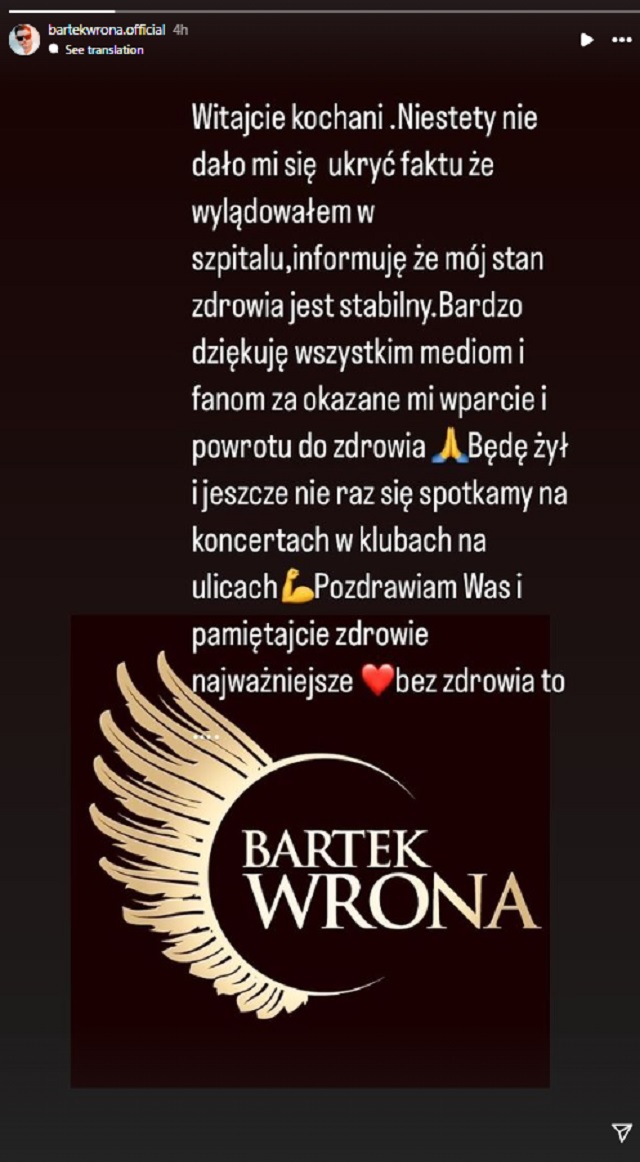 We wtorek Bartek Wrona zabrał głos na Instagramie. W krótkim oświadczeniu podziękował wszystkim za życzenia szybkiego powrotu do zdrowia. Wyjawił także, jak aktualnie się czuje.