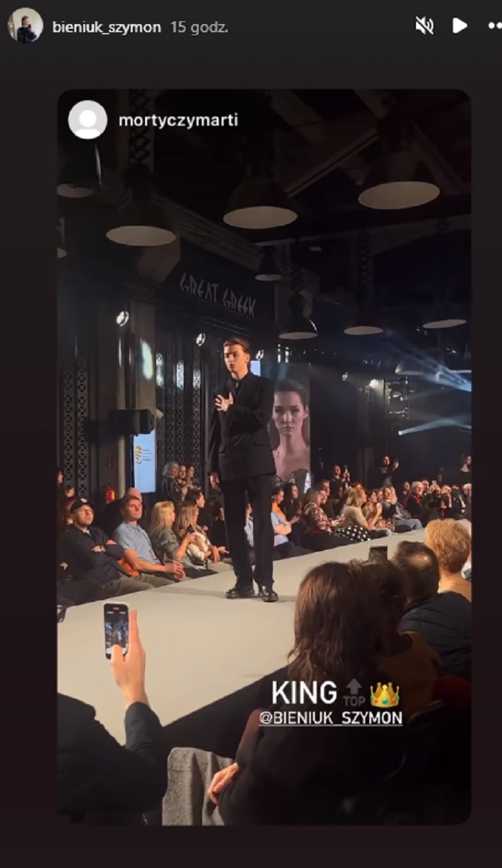 Szymon na swoim Instagramie zrelacjonował przebieg pokazu mody. Pokazał kilka nagrań i zdjęć, na których można zobaczyć go dumnie kroczącego po wybiegu w eleganckiej kreacji.