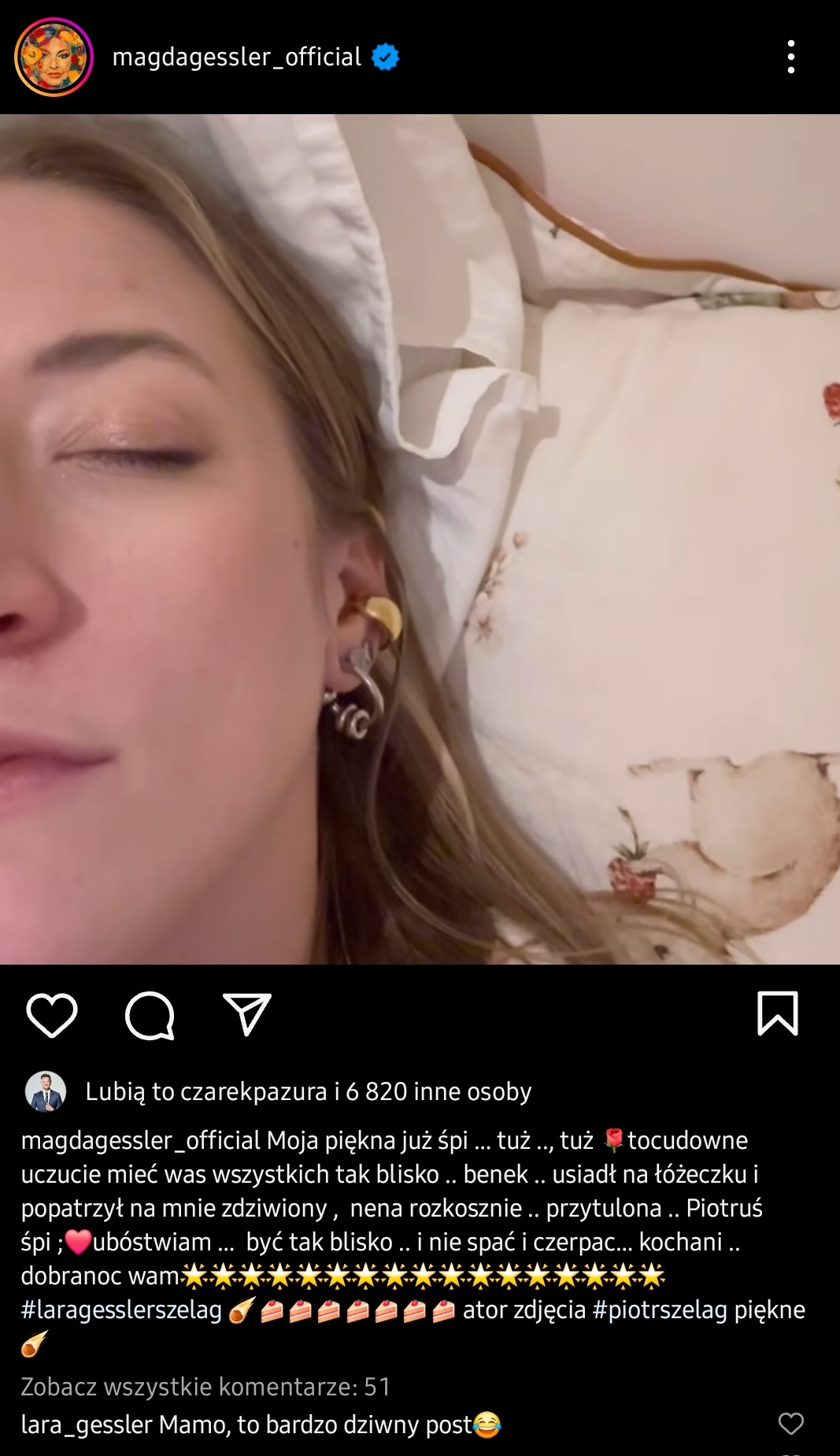 70-latka jest świadoma swojej popularności i idzie z duchem czasów. Samodzielnie prowadzi profil na Instagramie, publikując urywki z codzienności. Często dodaje do nich enigmatyczne opisy, które stały się jej znakiem charakterystycznym. Niedawno Gessler zamieściła w wirtualnej galerii zdjęcie córki. Fotografię śpiącej Lary wykonał jej mąż - Piotr Szeląg. Gwiazda "Kuchennych rewolucji" dodała do niego komentarz, który zaniepokoił 34-latkę (zachowana oryginalna pisownia - przy redakcji):