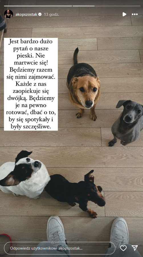 Jest bardzo dużo pytań o nasze pieski. Nie martwcie się! Będziemy razem się nimi zajmować. Każde z nas zaopiekuje się dwójką. Będziemy je na pewno rotować, dbać o to, by się spotykały i były szczęśliwe – napisał.