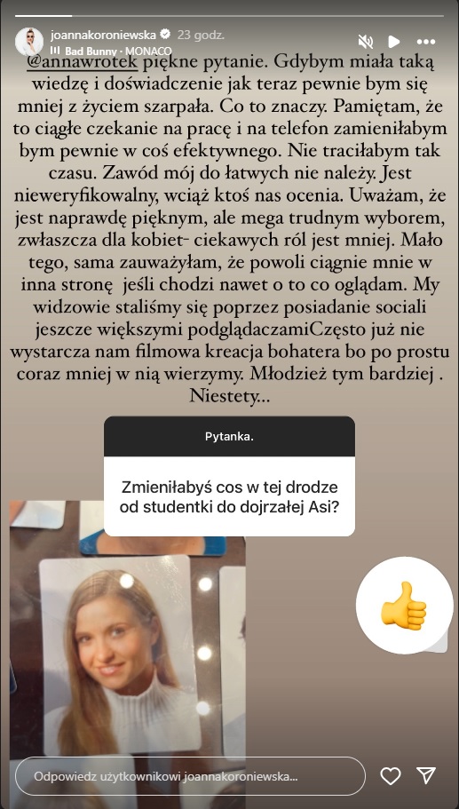 Joanna Koroniewska zamieściła na Stories obszerną odpowiedź, w której opowiedziała o konkretnych trudnościach, z jakimi mierzą się aktorzy. Wśród nich wymieniła między innymi czekanie na telefon z informacją, że dostała jakąś rolę. Wspomniała też o ciągłym ocenianiu przez innych.