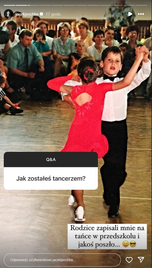 Jacek Jeschke jest aktywny na Instagramie, gdzie pokazuje, co u niego słychać. Teraz zdecydował się zaspokoić ciekawość internautów. Kiedy poinformował o rozpoczęciu popularnej serii Q&A, fani zapytali między innymi o to, jak to się stało, że został tancerzem. Ten odpowiedział, że przygodę z tańcem rozpoczął bardzo wcześnie, bo już w przedszkolu. Rodzice postanowili wtedy, że zapiszą go na te zajęcia. Opublikował również pamiątkowe zdjęcie z dzieciństwa.