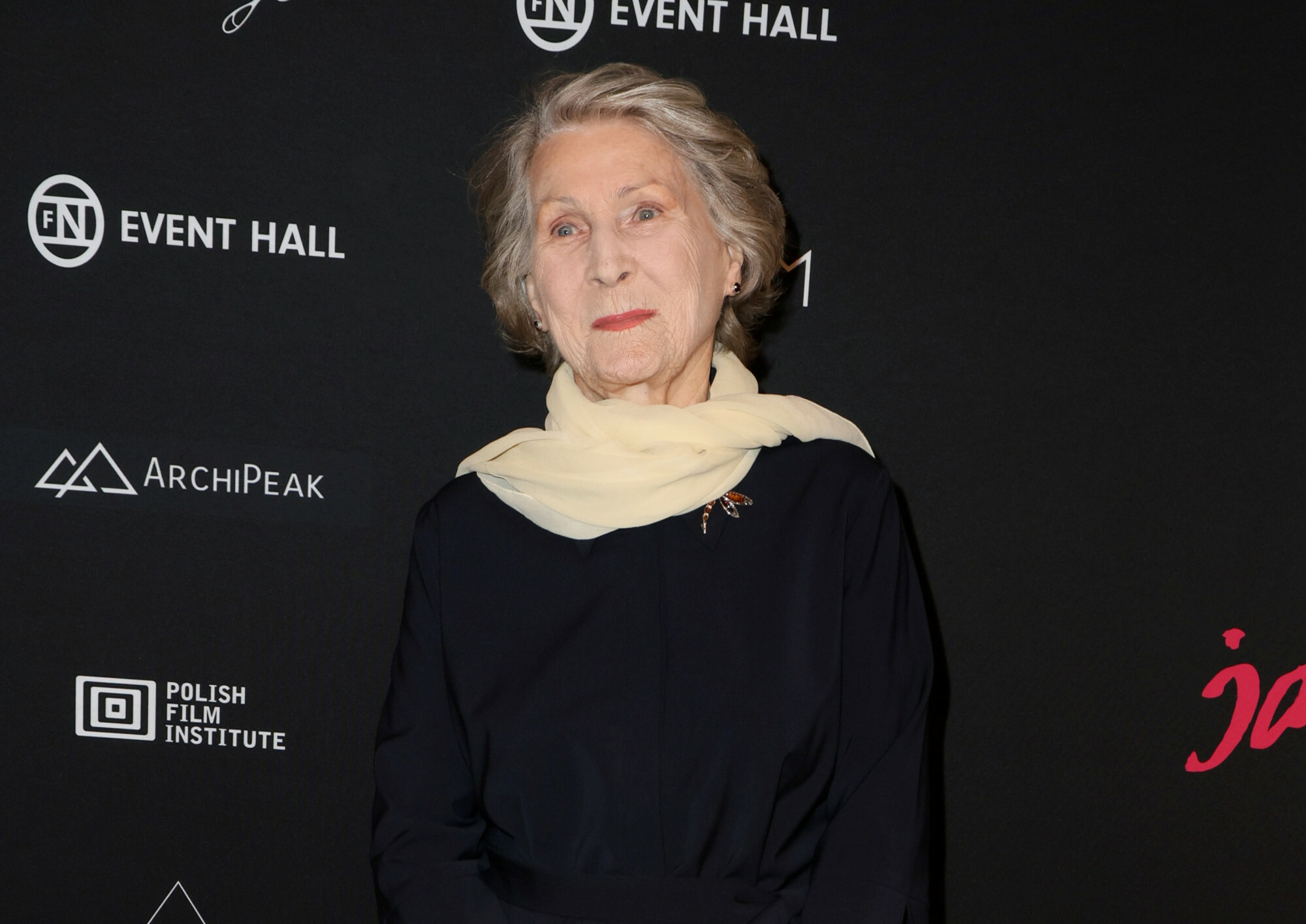 Na ściance zaprezentowała się w czarnej sukience do połowy łydki, wyróżniającej się rozkloszowanym dołem, a stylizację uzupełniła eleganckimi dodatkami w postaci broszki w kształcie ważki i przewiązanym na szyi beżowym szalem.
