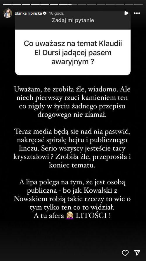 Blanka Lipińska podczas ostatniej sesji Q&A na swoim Instagramie dostała pytanie, które dotyczyło wykroczenia Klaudii El Dursi. Pisarka potwierdziła, że celebrytka źle zrobiła, po czym dodała: