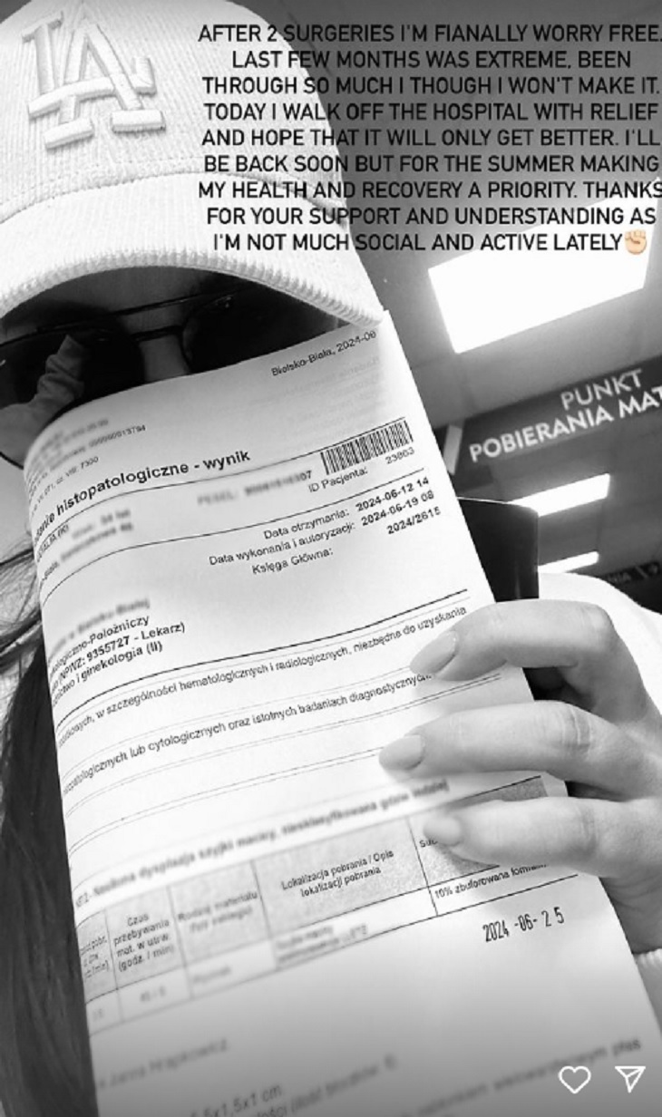 Natalia Janoszek ostatnio aktywna show-biznesowo była w maju – wtedy pojawiła się na czerwonym dywanie w Cannes. Później wycofała się, a czerwcowa publikacja kadru z placówki medycznej wiele wyjaśniła. 2 czerwca na jej Instagramie pojawił się kolejny materiał — celebrytka zrobiła sobie zdjęcie w szpitalu, trzymając w ręce wyniki badań. Wystosowała krótkie oświadczenie: