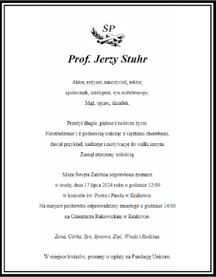 W krakowskiej prasie ukazał się już nekrolog Jerzego Stuhra. Podpisana pod nim rodzina przekazała szczegółowe informacje dotyczące pogrzebu. Ostatnie pożegnanie aktora rozpocznie się mszą świętą w środę, 17 lipca o godzinie 12:00 w kościele św. Piotra i Pawła w Krakowie. Następnie o 14:00 zmarły zostanie odprowadzony na Cmentarz Rakowicki, gdzie spocznie. To jednak nie wszystko – rodzina w nekrologu poprosiła uczestników ceremonii o to, aby zamiast kwiatów wpłacili datek na Fundację Unicorn – jej ambasadorem i członkiem założycielem był właśnie Jerzy Stuhr. Po śmierci aktora na stronie Fundacji ukazał się pożegnalny wpis, w którym przypomniano, że 77-latek od samego początku związany był z organizacją, która zajmuje się wspieraniem pacjentów chorych onkologicznie: