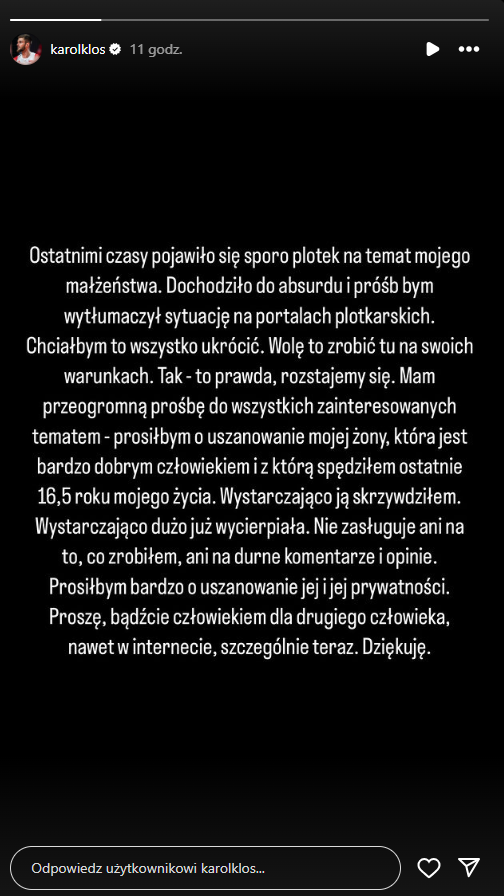 W mediach społecznościowych siatkarza pojawiło się oświadczenie, w którym 34 latek poinformował o zakończeniu małżeństwa. Przypomnijmy, że para poznała się w czasach szkolnych, a na ślubnych kobiercu stanęła w 2017 roku. Karol i Ola spędzili ze sobą prawie 17 lat.
