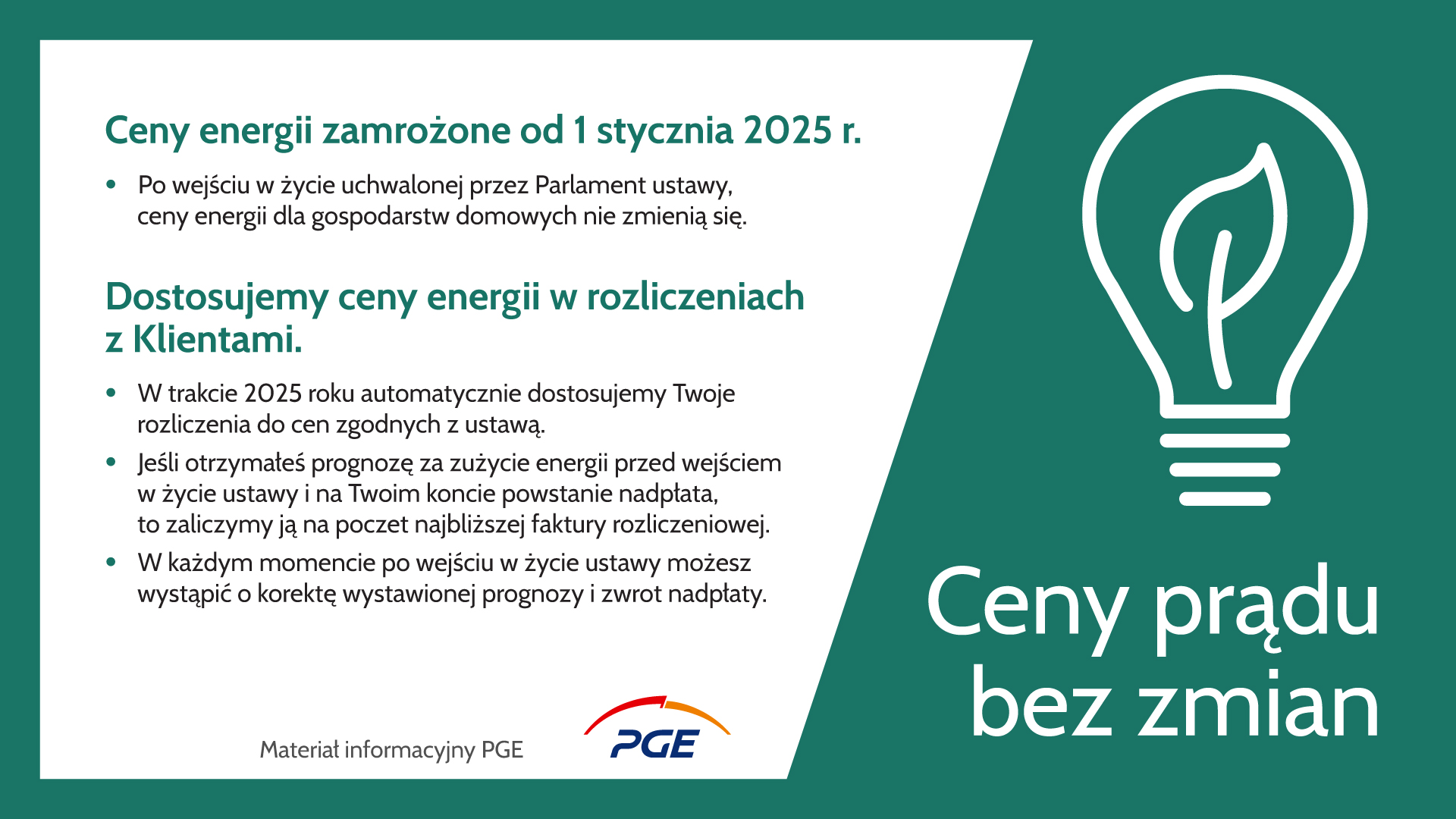 Jeśli klient PGE zapłaci za energię zgodnie z prognozą wystawioną przed wejściem w życie ustawy i na jego koncie powstanie nadpłata w związku z zastosowaniem w rozliczeniach zamrożonej ceny energii elektrycznej, to zostanie ona wykorzystana do rozliczenia kosztów energii elektrycznej w kolejnych okresach lub na wniosek klienta zostanie zwrócona. Po wejściu w życie ustawy klienci PGE mogą wystąpić o wystawienie nowych prognoz zgodnych z zamrożoną ceną – czytamy na stronie PGE.