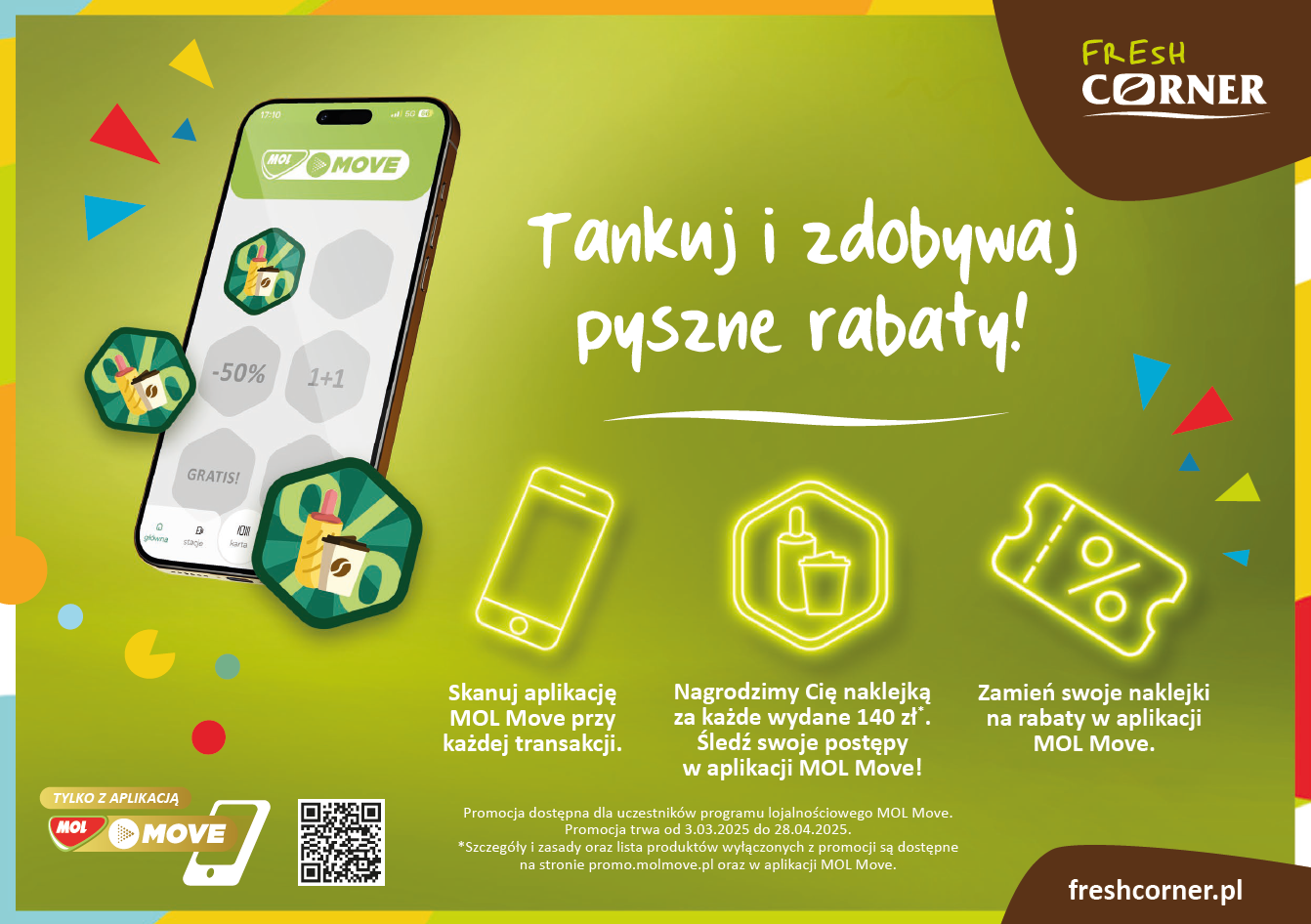 Wiosenna promocja lojalnościowa MOL skierowana jest przede wszystkim do półtora miliona użytkowników programu lojalnościowego MOL Move. Dzięki naklejkom, które kierowcy otrzymywać będą za każde 140 zł wydane na paliwa, mogą oni uzyskać zniżki na hot-dogi, kawę i inne przekąski z oferty gastronomicznej oraz sklepowej stacji. Aby skorzystać ze zniżki, należy w aplikacji wymienić zebrane naklejki na kupony, a te na wybraną ofertę specjalną. Im więcej zebranych naklejek, tym większe dostępne zniżki. Już sześć naklejek zebranych w aplikacji uprawnia do odbioru ulubionej przekąski lub kawy gratis.