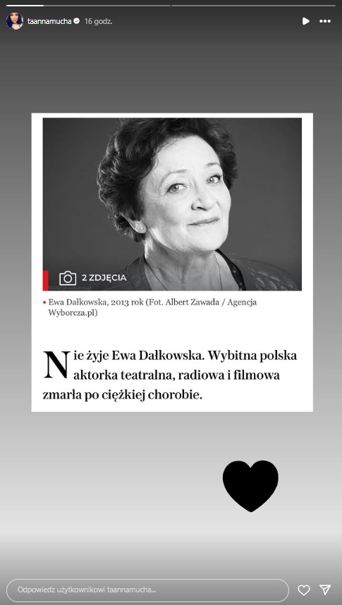 Anna Mucha niezwykle ceni sobie kontakt z fanami. Wykorzystuje do tego Instagram, gdzie informuje m.in. o swoich zawodowych przedsięwzięciach. 45-latka obecnie gra w serialu „M jak miłość”, a także realizuje swoje projekty w teatrze. Aktorski świat jest więc bardzo ważny dla Ani Muchy, a każde odejście osoby związanej z tym zawodem wywołuje smutek wśród kolegów z branży. Stąd też serialowa Magda z „Mjm” postanowiła pożegnać zmarłą 8 czerwca aktorkę: Ewę Dałkowską. Publikując na instagramowej relacji fragment artykułu opublikowanego na portalu „Wyborcza.pl”, Mucha dodała emotikonę czarnego serca – jako wyraz pamięci i szacunku.