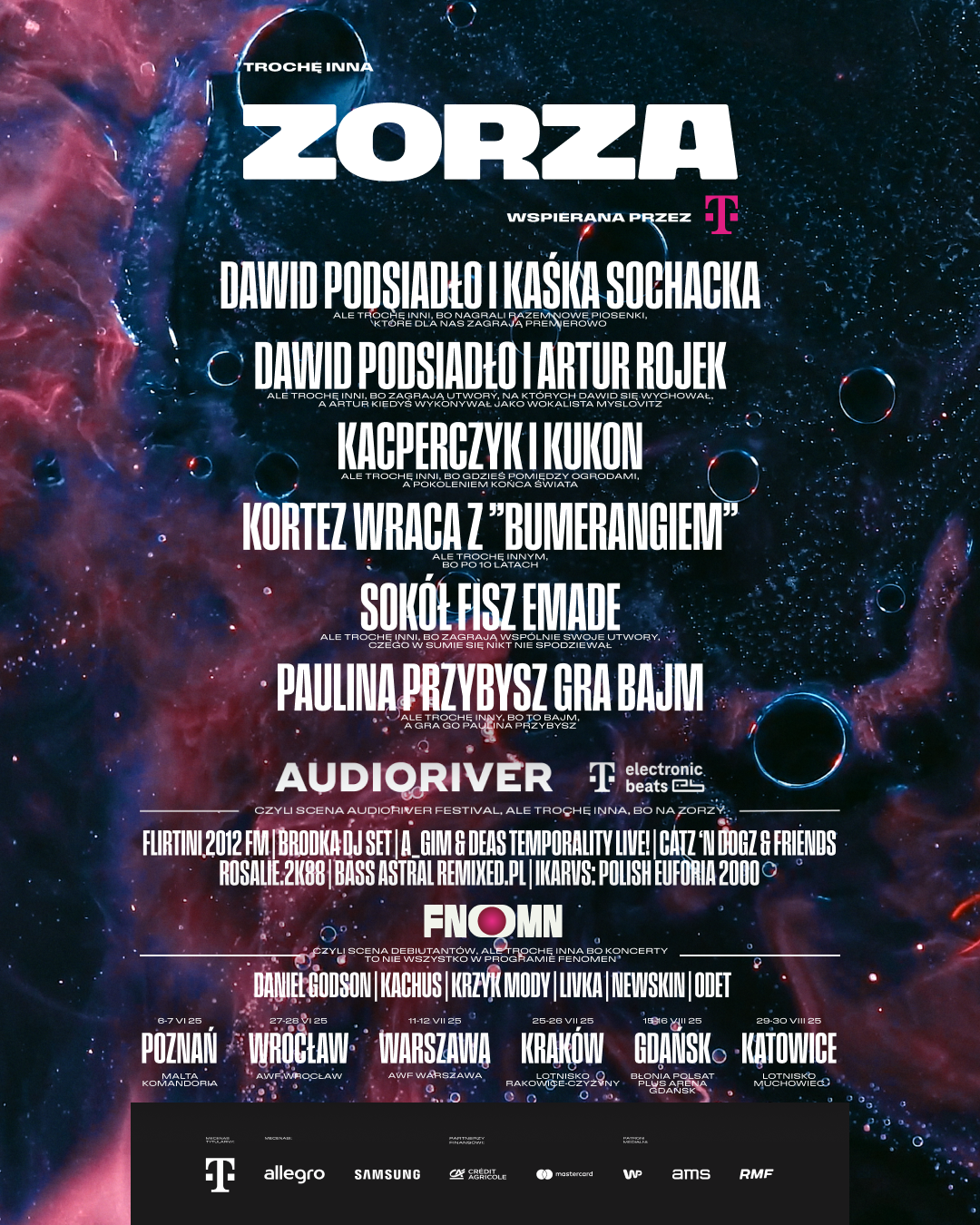 ZORZA wspierana przez T-Mobile to festiwal, na którym muzyczne światy zderzają się i łączą w projekty, o jakie trudno gdzie indziej. Jednym z nich jest zespół zebrany przez Dawida Podsiadłę i Artura Rojka specjalnie na potrzeby tegorocznej edycji. Dołączyli do nich wspaniali muzycy, reprezentujący różne style i pokolenia: Magdalena Kodrylasińska-Pękala, Aga Bigaj, WaluśKraksaKryzys, Aleksander Świerkot, Tomasz Skórka oraz Łukasz Moskal. W tym składzie również powstały dwa wykonania - „Dla Ciebie” i „Alexander” - zarejestrowane na dachu legendarnego Spodka. Zespół w tym składzie wróci do Katowic na finał gdzie będzie można usłyszeć ten projekt na żywo – a ponad to właśnie występ w Katowicach zostanie zarejestrowany i wydany jako płyta LIVE.