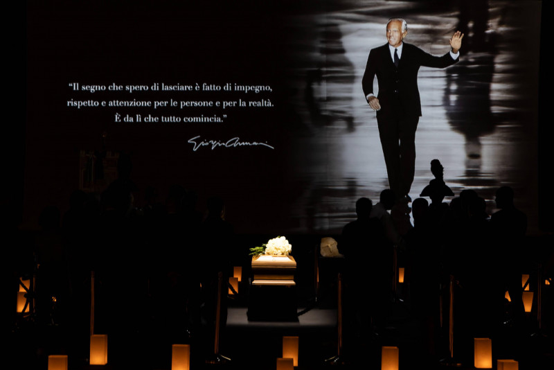 Zanim odbył się pogrzeb, Mediolan przez dwa dni żegnał swojego najsłynniejszego projektanta. W miniony weekend Armani Teatro, gdzie przez lata odbywały się najważniejsze pokazy i wydarzenia marki, przekształcono w kaplicę żałobną, w której ustawiono trumnę ozdobioną białymi różami i otoczoną 300 lampionami. Ciszę wypełniała muzyka Ludovico Einaudiego.