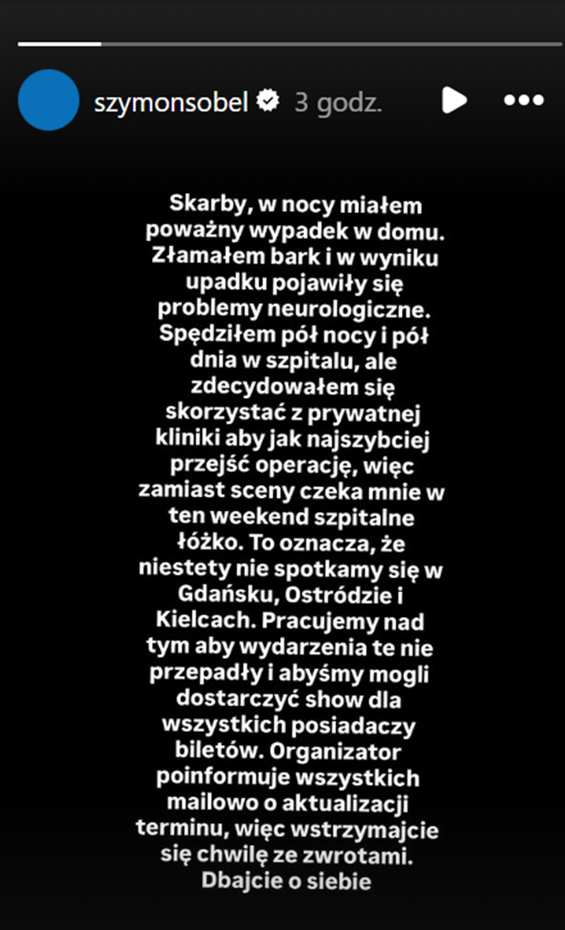 Sobel przekazał też, że wybrał klinikę prywatną, aby bark został jak najszybciej zoperowany. Niestety miało to swoje konsekwencje – artysta odwołał swoje nadchodzące koncerty: