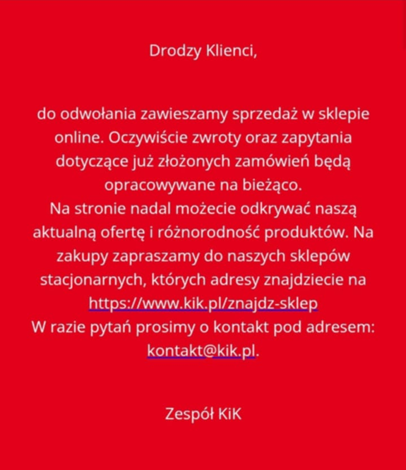 KiK za pośrednictwem swojej strony internetowej informuje o zawieszeniu sprzedaży w sklepie online. Powód nie został ujawniony. Firma poinformowała jedynie, że decyzja będzie obowiązywać „do odwołania”, natomiast zwroty i pomoc dla klientów nadal działają normalnie. Osoby chcące skorzystać z oferty KiK zaproszono do placówek stacjonarnych.