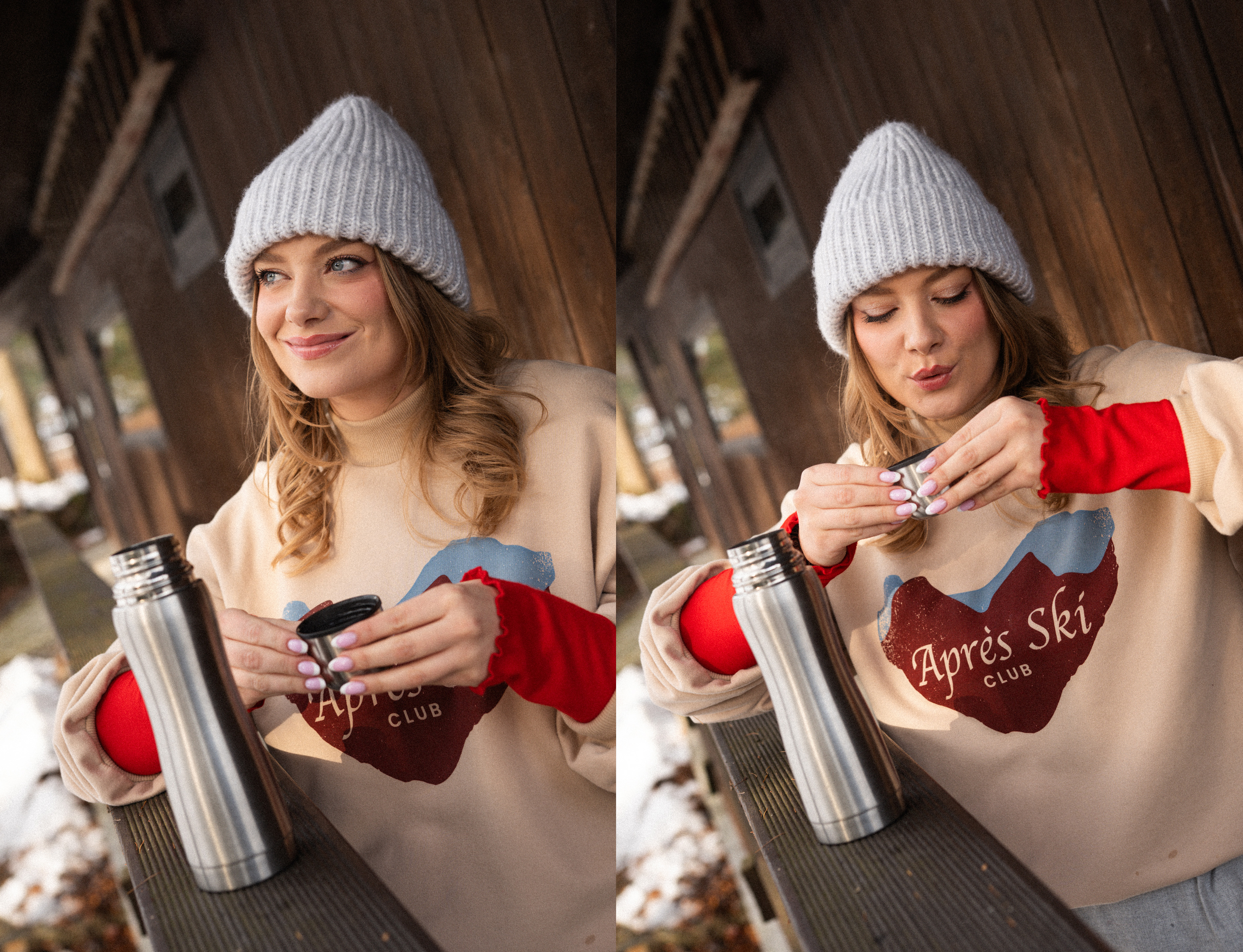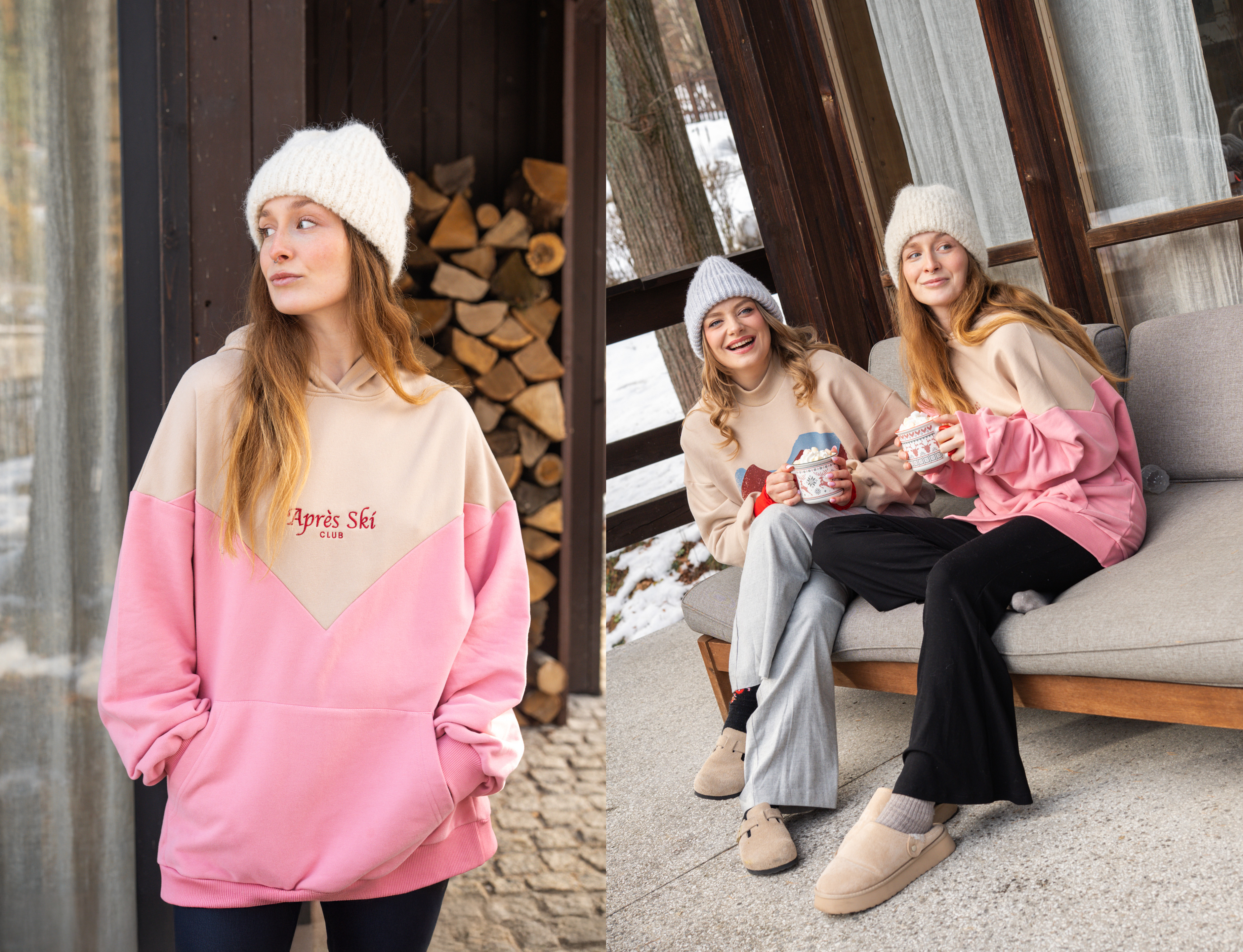 Nic tak nie tworzy cozy mood jak bluza, która otula i grzeje. Modele Après Cream i Melisa Après Ski mają wykończenie peach skin, które sprawia, że materiał jest wyjątkowo miękki i przyjemny w dotyku. Ich oversize’owy krój dodaje swobody i dobrze układa się na sylwetce.
