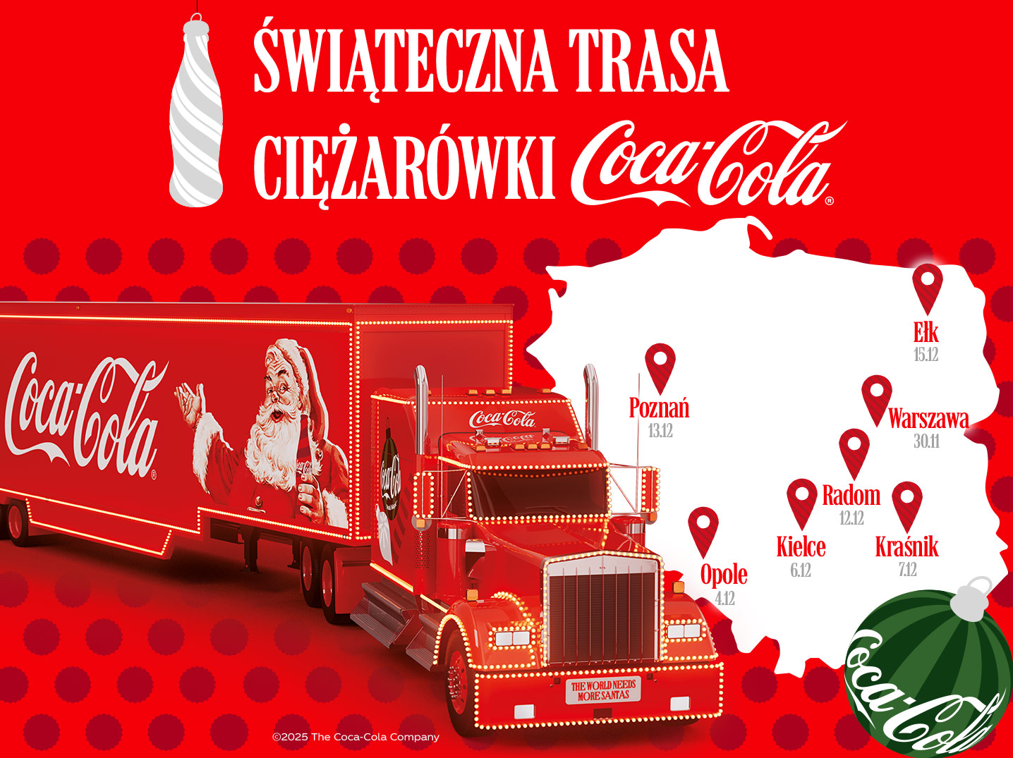 W tym duchu Coca-Cola po raz kolejny zachęca wszystkich, by zatrzymali się choć na chwilę w codziennym pośpiechu i zaprasza do wspólnego przeżywania radosnych momentów. Ciężarówka odwiedzi Warszawę (30.11), Opole (4.12), Kielce (6.12), Kraśnik (7.12), Radom (12.12), Poznań (13.12) i Ełk (15.12). Na każdym przystanku, na odwiedzających czekać będą świąteczne aktywacje, w tym fotobudka 360°, interaktywna gra, dekorowanie bombek i ekran do wysyłania życzeń. W wybranych miastach pojawi się także foodtruck przygotowany we współpracy z siecią Biedronka.