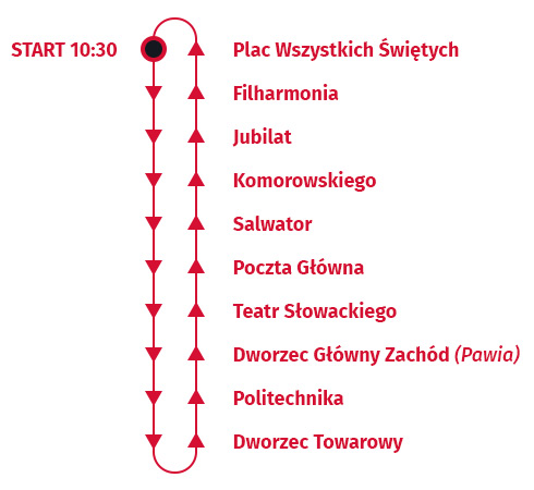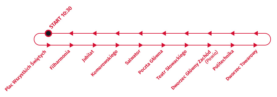 Salwator – Plac Wszystkich Świętych – Poczta Główna – Dworzec Towarowy.
