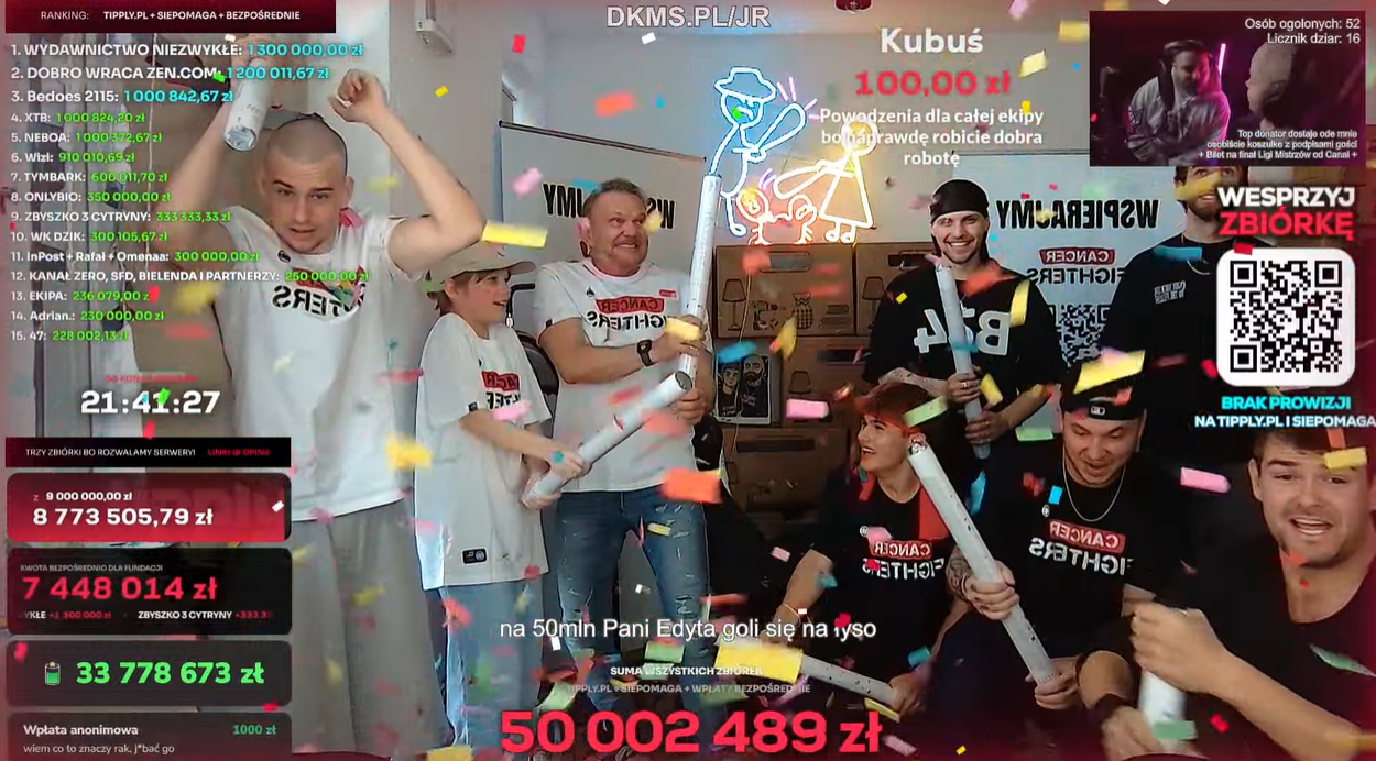 Tiktoker Piotrek, działający w sieci jako Łatwogang, od kilku dni prowadzi na YouTubie streama charytatywnego. Cała akcja zapoczątkowana została przez Bedoesa, który wypuścił nagrany we współpracy z Mają Mecan, podopieczną Fundacji Cancer Fighters, utwór: „Ciągle tutaj jestem (diss na raka)”. Transmisja rozpoczęła się 17 kwietnia, a liczba wpłat dla Fundacji Cancer Fighters 25 kwietnia przekroczyła już 50 milionów!