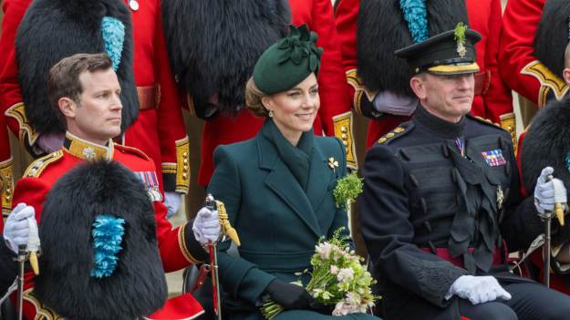Kate założyła ciemnozielony płaszcz i pasujący do niego kapelusz. W takiej stylizacji dołączyła do parady i wzięła udział w tradycyjnej prezentacji dekoracyjnych gałązek koniczyny oficerom i gwardzistom. Nawet maskotka regimentu, irlandzki wilczarz, nie została pominięta, otrzymując od niej koniczynę do ozdobienia swojej sierści.